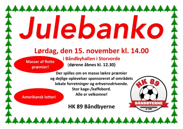 Vi er ved at være klar til årets julebanko i Båndbyhallen på lørdag, den 15. november. Vi åbner dørene kl. 12.30 og spillet begynder kl. 14